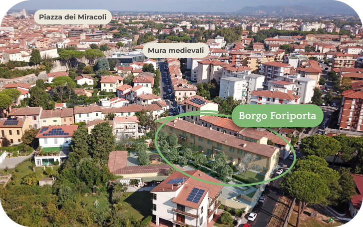 A pochi passi dall’antica Porta Calcesana, una delle porte urbane nella cinta muraria del 1156, nella zona orientale della città, in un’area situata in corrispondenza dell’incrocio tra via Cisanello e via Valentino Baldacci.